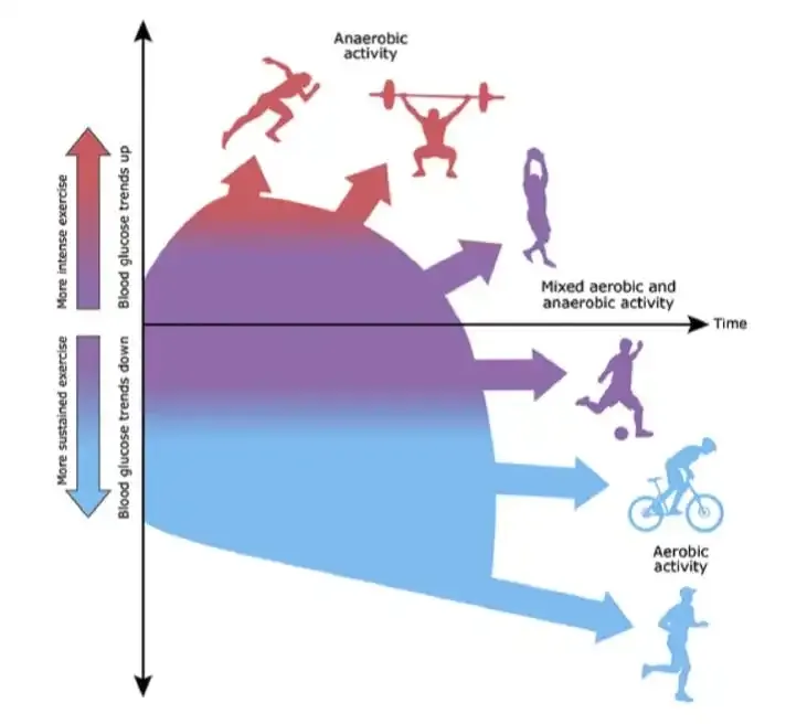 Figure 1. Illustration of different types of exercise including mutual differences in intensities and the way this affects glucose levels. Illustration by Anne Greene, Senior Medical Illustrator, reproduced with permission from UpToDate, Inc. Copyright © 2017 Duration and intensity. Reproduced with permission from: Riddell MC. Management of exercise for children and adolescents with type 1 diabetes mellitus.